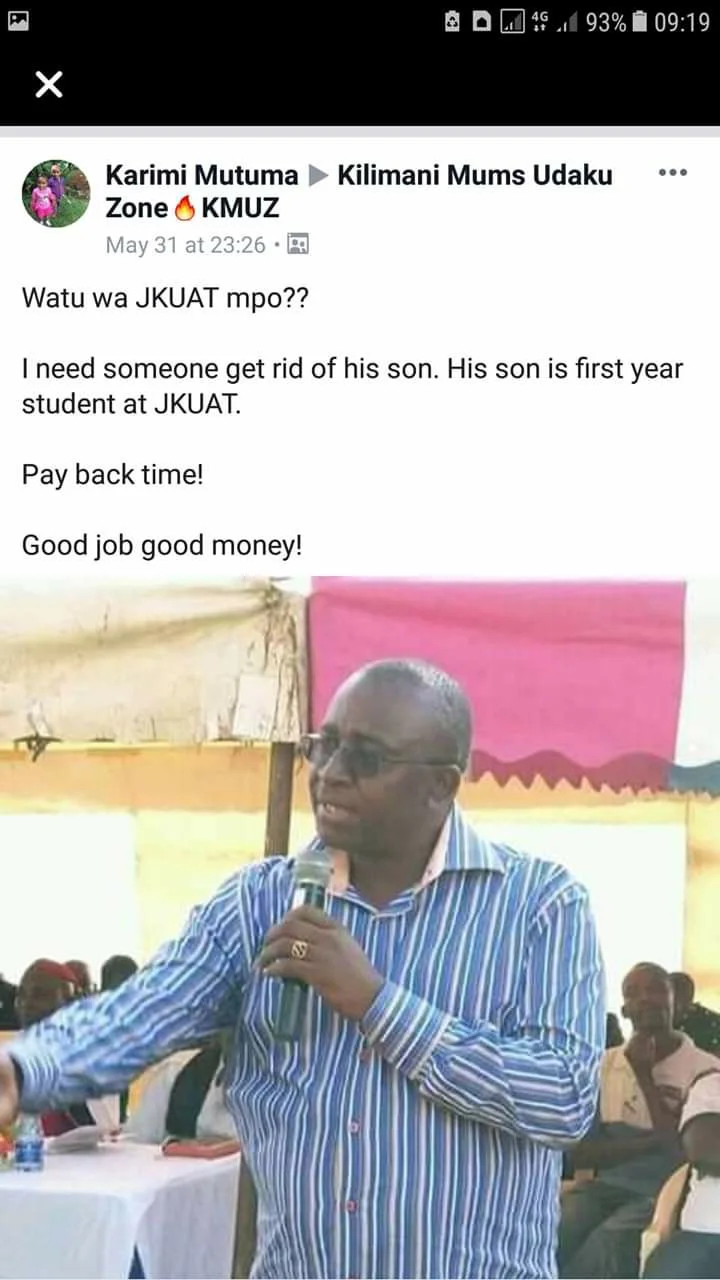 In another post, she says that she needs someone to get rid of Linturi’s son who is a First Year student at the Jomo Kenyatta University of Science and Technology.