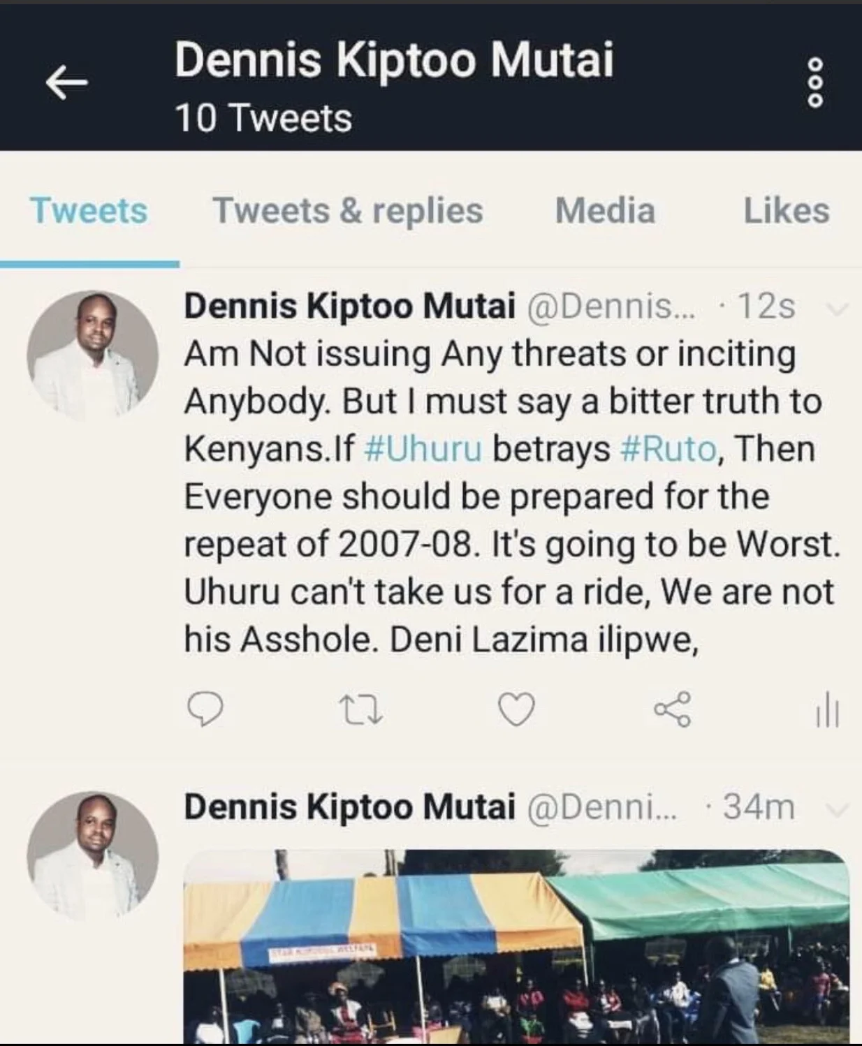 The social media user, Dennis Kiptoo Mutai had tweeted threatening post-election violence if Kikuyus fail to pay their debt of voting for William Ruto as per the MOU.
