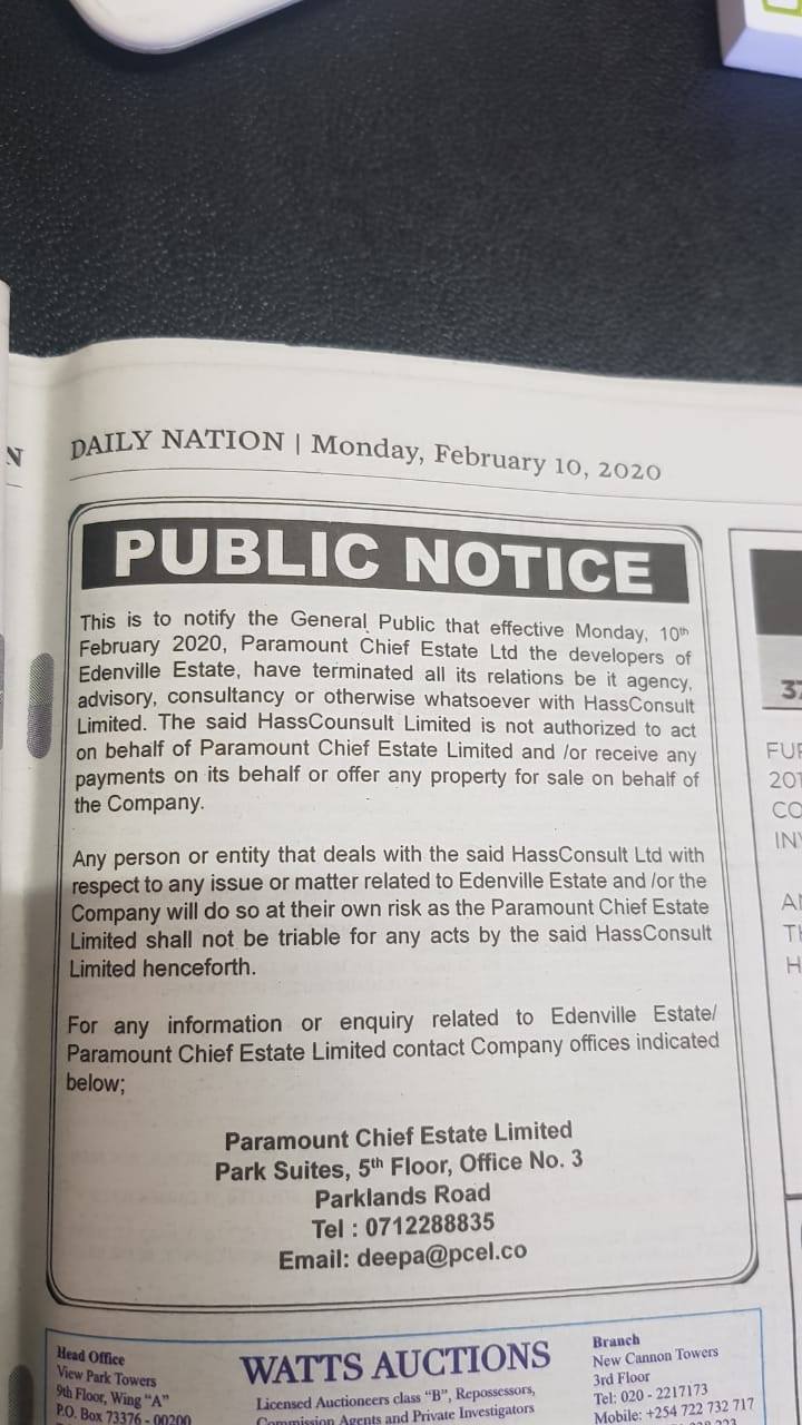 Well, Hass Consult has been barred from transacting on behalf of Edenville along Kiambu Road.