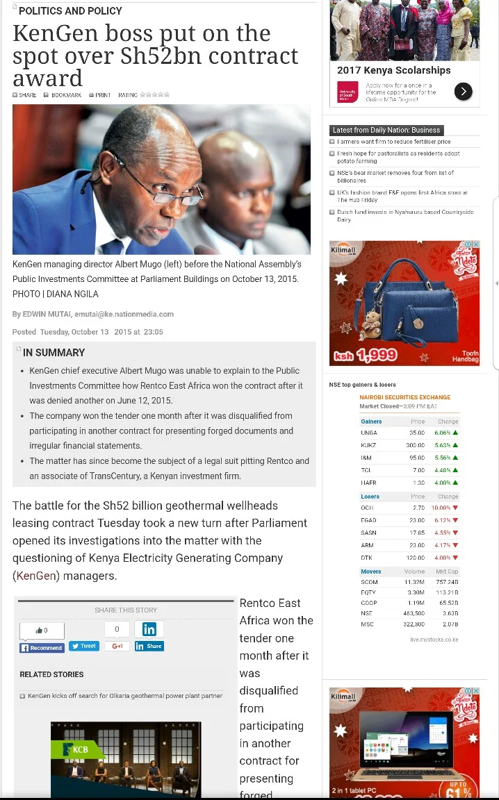 8th October 2015 request for downpayment – 13 october 2015 Rentco/ Ken Gen deal discussed by Parliament’s PIC – 2nd December 2015 Jaindi Kisero request for Payment – 16th Ddecember Rentco says come for your payment. Jaindi Kisero writes a lot about KenGen but nothing about this deal with his byline.