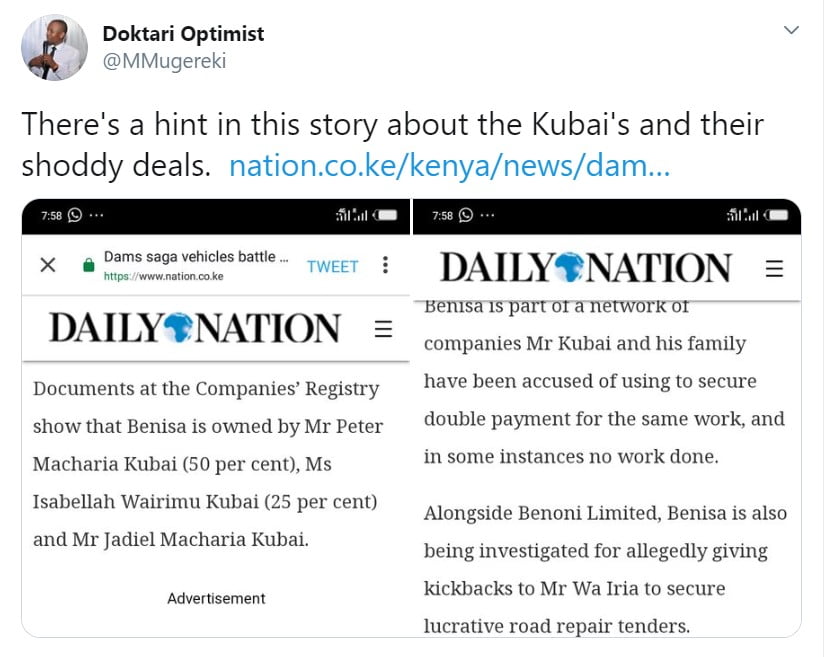 According to a Daily Nation publication from December 2019, Peter Macharia Kubai and Isabellah Wairimu Kubai are joint directors of Benisa Limited, a firm which at the centre of two separate investigations by the Ethics and Anti-Corruption Commission (EACC) into Murang’a Governor Mwangi wa Iria’s alleged violation of the public procurement law and ghost projects in the county.