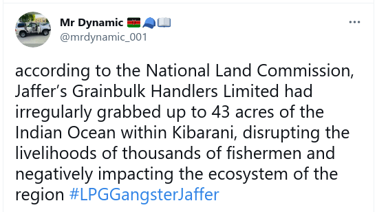In 2019, according to the National Land Commission, Jaffer’s Grainbulk Handlers Limited had irregularly grabbed up to 43 acres of the Indian Ocean within Kibarani, disrupting the livelihoods of thousands of fishermen and negatively impacting the ecosystem of the region.