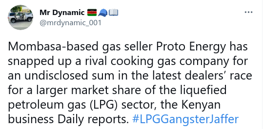 Most recently, the billionaire is said to have hardened his grip on the sector after Mombasa-based gas seller Proto Energy, associated with Jaffer, was reported to have snapped up a rival cooking gas company for an undisclosed sum.