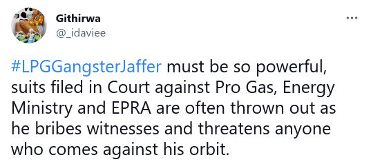 Suits filed in Court against Pro Gas, Energy Ministry and EPRA are often thrown out as he bribes witnesses and threatens anyone who comes in his way.