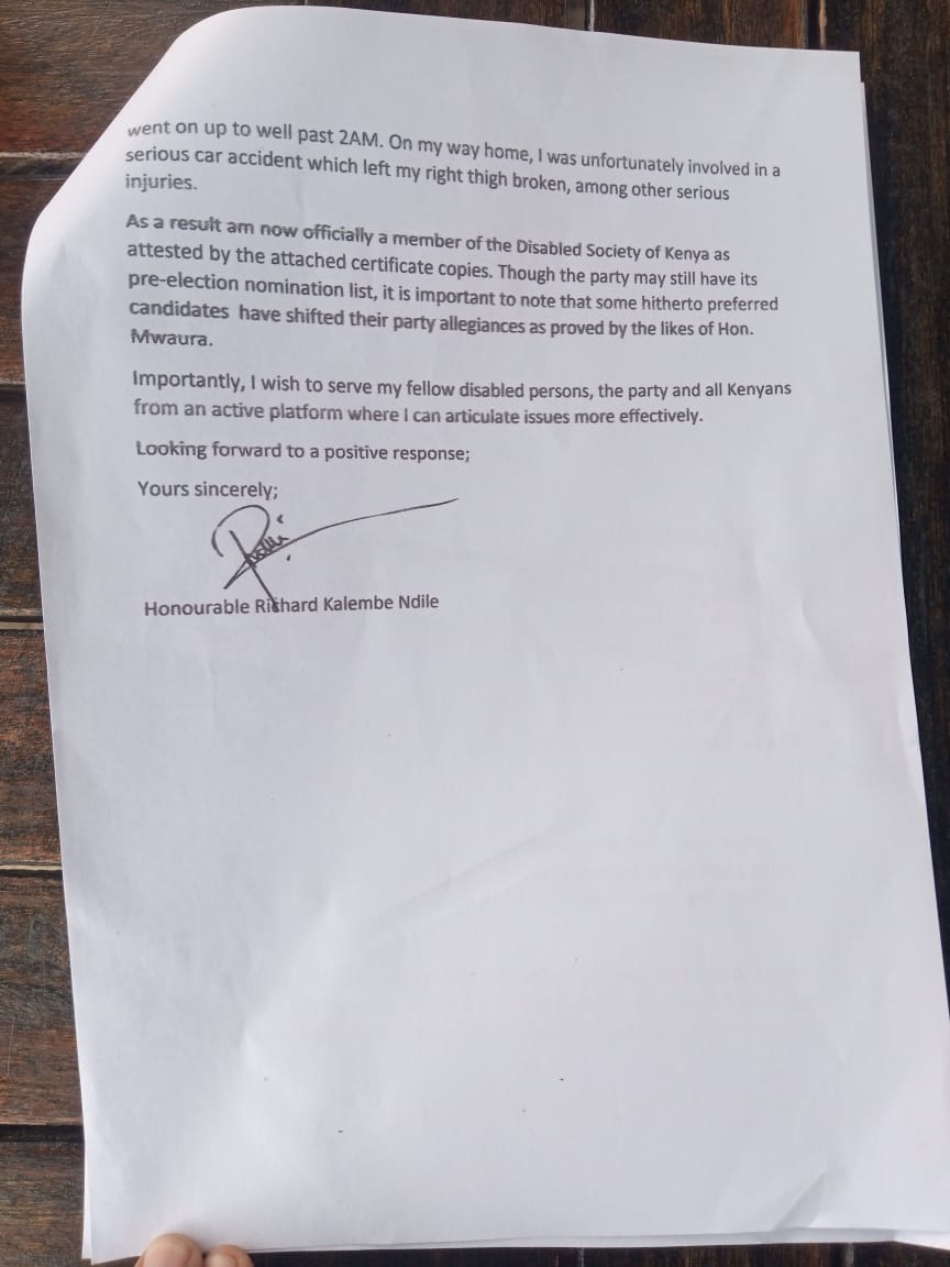 In a letter that circulated on social media on Thursday, Kalembe Ndile now wants to replace ousted Senator Isaac Mwaura as the representative for People Living With Disability (PLWD) in Kenya.