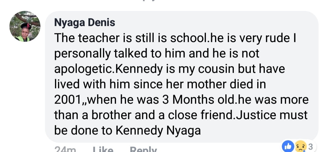 A Facebook user by the name Nyaga Denis claims that Kennedy Fundi Nyaga, his cousin, met his death after he received a thorough beating from his Mathematics teacher Mr. Mureithi Mwai.