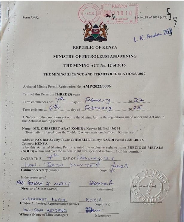 Early last year 2 days before he left office, CS John Munyes signed an Artisanal Mining licence to the Mzee.