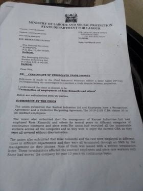 Speaking exclusively to nyakundireport.com, one of the affected employees divulged how the management at Kartasi Industries Limited acted in contravention to recommendations by the State Department for Labour in regards to a job termination dispute filed on their behalf by the Kenya Union of Printing, Publishing, Paper Manufacturers & Allied Workers (KUPRIPUPA).