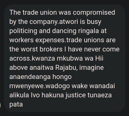 The current word on the ground is that the trade union (KUPRIPUPA) officials were compromised through brown envelopes sent by Kartasi.