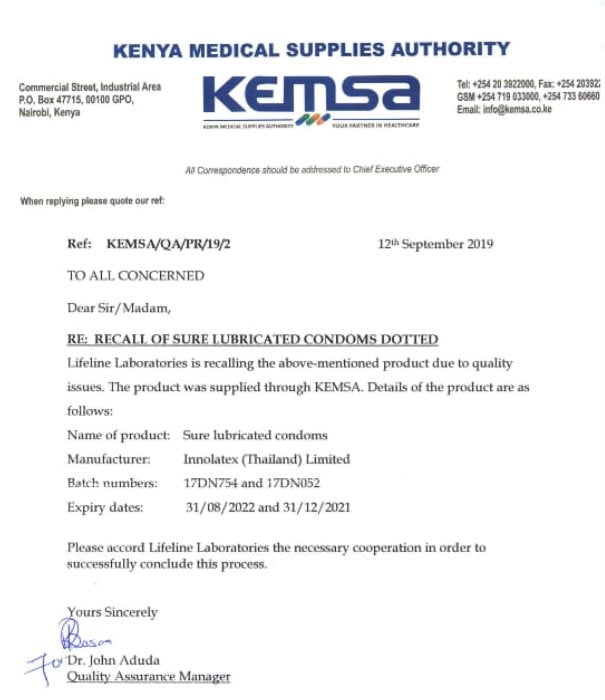 In a Letter to Newsrooms, KEMSA said that Lifeline Laboratories, the makers of Sure Condoms have recalled it due to quality issues.