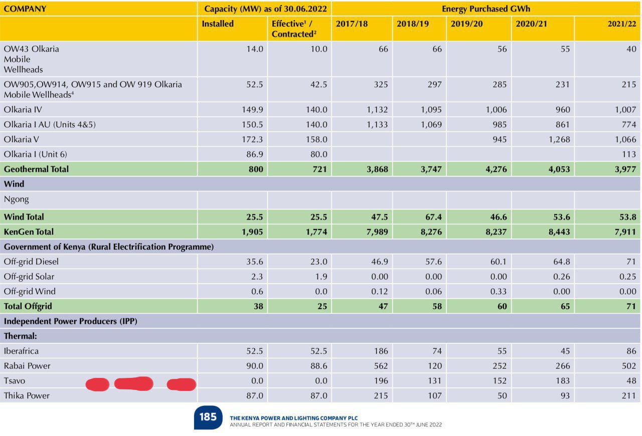 Tsavo Power was paid for supplying electricity without any PPA | Source KPLC Annual Report 2021 - 2022It is clear that the IPPs have won once again, but what is more painful is that this is the regime that came to power on the back of helping the poor of the poor, the so-called hustlers. Most IPPs, use thermal means, i.e. burn fossil fuels to produce electricity. This is expensive, what Kenya should do is to stop renewing licenses for IPPs once they expire. However, for some reason, this seems to be a tall order as you can see Tsavo Power supplied KPLC with electricity long after their license had expired. An economist’s take David Ndii’s sentiments attracted bashing from a section of Kenyans who understand the economics of energy production. In his defence, Ndii made other remarks that revealed the true nature of the govt policy in energy. https://nyakundireport.com/opinion-david-ndiis-comments-on-costly-power-shows-the-economic-hitmen-imf-world-bank-and-blackrock-are-firmly-in-charge/ “One more time. Power cost reduction is to protect profitability so as to attract more private investment into the industry. No intention to pass cost benefits to consumers. At best, tariffs will not go up as fast as they otherwise would. The future is more IPPs, not less,” he said. Former Saudi Central Bank economist Mohamed Wehliye responded to the above by stating these: “More IPPs? How can that be David when Kengen supplies 72% of power but IPP boys eat 52% of money paid to power producers? When Kenya Power is paying Kengen Ksh 16 for unit of power and as high as Ksh 170 for IPPs? How can more of this rip off be good?. And there is no sight of relief. These guys will be eating until we all fall dead. Now you want to add more of these blood suckers? Hell NO!,” he wrote sharing the below photo. It now seems that Kenyans must brace for expensive energy even as it produces what can comfortably supply electricity to the whole country for cheap. Some reports have indicated that Kenya energy producers sometimes switch off power plants to keep up high costs of electricity.