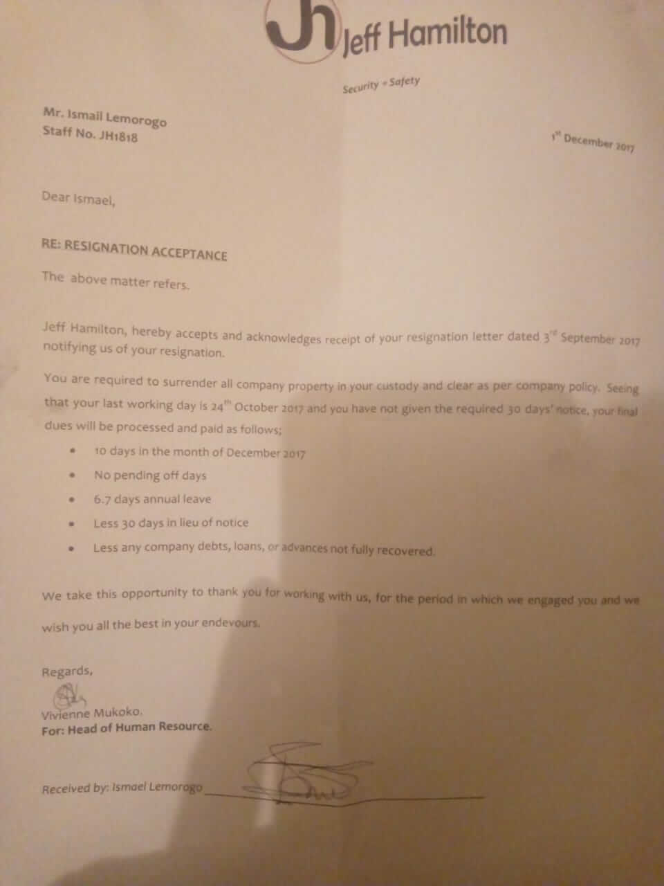 Caption: Resignation acceptance letter from Jeff Hamilton security firm to their former employee.
