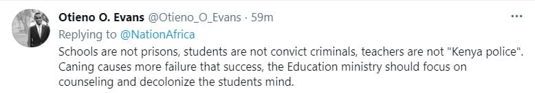 "Schools are not prisons, students are not convicted criminals, teachers are not Kenya police. Caning causes more failure than success," noted Otieno Evans.