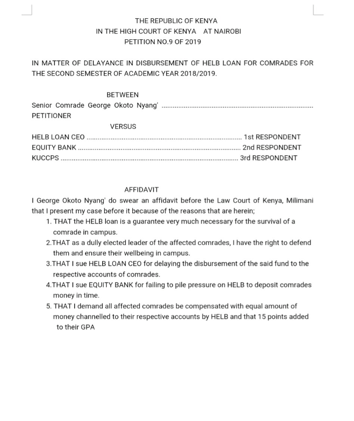 A KENYATTA University student has filed an affidavit suing the HIGHER LOANS EDUCATION BOARD for causing delays on comrades due to delayed remittance of the HELB which sustain comrades at school.