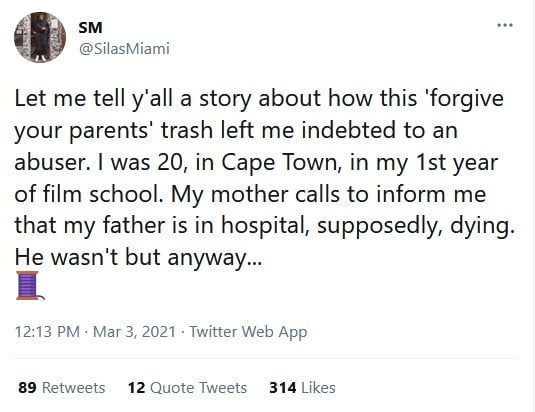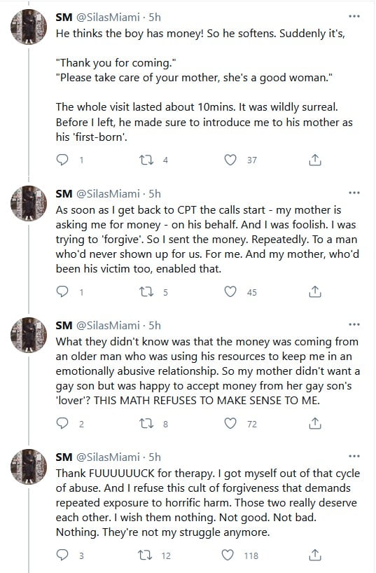 Through a long Twitter thread pieced up in the afternoon, Miami, who is based in South Africa, also narrated to his followers the story of how pressure to forgive his parents left him indebted to an abuser whom he was dating at the time.