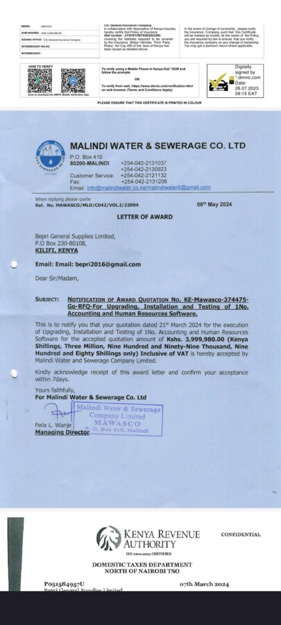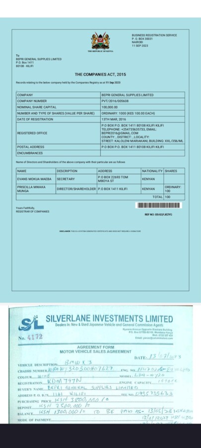 “Hi Cyprian, I’d like to whistleblow on a certain Procurement officer in Kilifi County on conflict of interest and corruption. I have all the information and supporting documents. Priscilla Mwaka Munga, a principal procurement officer in the county government of Kilifi though a public servant, has gone on to accumulate vast wealth through unscrupulous procurement methods and schemes. Priscilla Munga is the majority shareholder and director of her company, Bepri General Supplies Limited. Her company, Bepri General Supplies Limited, was awarded a total of 4 tenders between 2019-2020 by County Government of Mombasa, County Government of Kwale, and County Government of Machakos totaling to KES 23,838,794. Through her company Bepri, she proceeded to buy a piece of land along the Mombasa-Malindi highway (L.R. 5054/735) some meters from Naivas supermarket at KES 8 million. She initiated the purchase of a beach plot along Bofa road (Block 4 UNS. Residential NO 251) at KES 11 million, securing it with a KES 4 million deposit. Priscilla purchased a 2.5-acre parcel of land (Kilifi/Mtondia 2137) at KES 2.4 million in the Jamii town/Mtondia area. Some 17 acres were purchased along the Kilifi-Ganze route at Mrima wa Kuku area. In Malindi, Priscilla purchased a beach plot in Watamu, and some two other parcels of land. Also purchased was a Toyota Hilux (KCT 080P) at KES 3.5 million, a Mazda CX5 (KCX 620V) at KES 1.8 million. She went on to construct a one-storey bedsitter complex within Kilifi Town. Managed by a rental agent, she earns a monthly rental income of KES 30,000 which is paid into her account by her ex-husband, Bernard Kamwende Ndzai, a former KEMRI employee who resigned 6 years ago and has since been rendered an alcoholic pauper since their separation 5 years ago. Priscilla also constructed some 18-unit bedsitters opposite the County Government of Kilifi’s Public Service Board offices in Fumbini area. The units are mainly vacant thus no rental income collected. In her tenure, she served as the principal procurement officer of roads, County Government of Kilifi, where she commenced a symbiotic sexual relationship with the then Chief of Roads. She managed to hatch a plan where she not only schemed but also invited, evaluated, and awarded herself tenders by proxy to the companies of her closest allies and family members. Her allies being; Daniel Sanga, a casual at Ministry of Roads, County Government of Kilifi, Daniel’s Girlfriend, Maureen Murigi, Faith Cherono, Christine Mkamburi, a casual at Ministry of Lands, County Government of Kilifi, Priscilla’s brother Jackson Chilumo, and his wife’s company were also used in this tendering scheme. Upon payment, the mentioned parties would withdraw the funds from their company’s accounts and deliver the funds to Priscilla Munga in hard cash in exchange for a small monetary token. The scheme runs up to date. She was also able to buy tenders from the former Member of County Assembly, Ganda Ward, Reuben Katana in the financial year 2020/2021. Even if Priscilla’s company Bepri only legitimately worked for less than two years, in June 2023, she received a tender payment into Bepri’s bank account at Premier Bank, from the County Government of Narok through forged documents and unclear circumstances. In June 2022, Priscilla embarked on the construction of a 4-bedroom mansion in the Jamii Town/Mtondia area (Kilifi/Mtondia 2137) costs running KES 24 million. The project was funded by a mortgage Priscilla had received from the County Government of Kilifi in August 2023, a KES 1 million loan from Imarika Sacco in January 2024, the rest of the construction costs were covered by the hard cash received from the fraudulent tendering scheme. In July 2023, Priscilla acquired a 2014 BMW X3 (KDM 797N) at KES 3.8 million, which has now been gifted to the current director of Malindi Water, in exchange for future award of tender works. For example, Letter of award, reference number: MAWASCO/MLD/C042/VOL.1/23994. Her company was also awarded two tenders in the County Government of Makueni in the financial year 2023/2024 amounting to KES 6,673,791. With a monthly income of less than KES 70,000, of which KES 30,000 is from her rental income, her two children Hope Kanazi and Robert Ndzai have been fortunate enough to school at Kivukoni School for the past 4 years, with a combined fee of KES 500,000 per term. She has no other businesses nor any other source of income besides her fraudulent tendering schemes and rental income. The matter was reported to EACC report number 110734.”