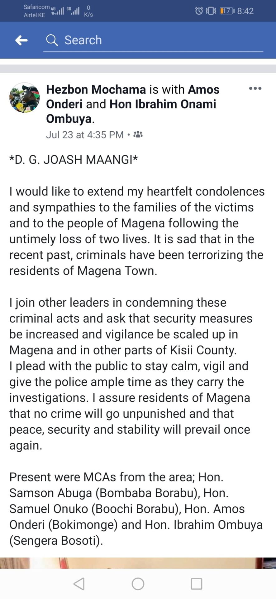 At 3am this morning at Magena in Kisii County, police officers arrested Hezbon Mochama who has for a week been in the forefront to demand for security to be heightened in his home town of Magena.