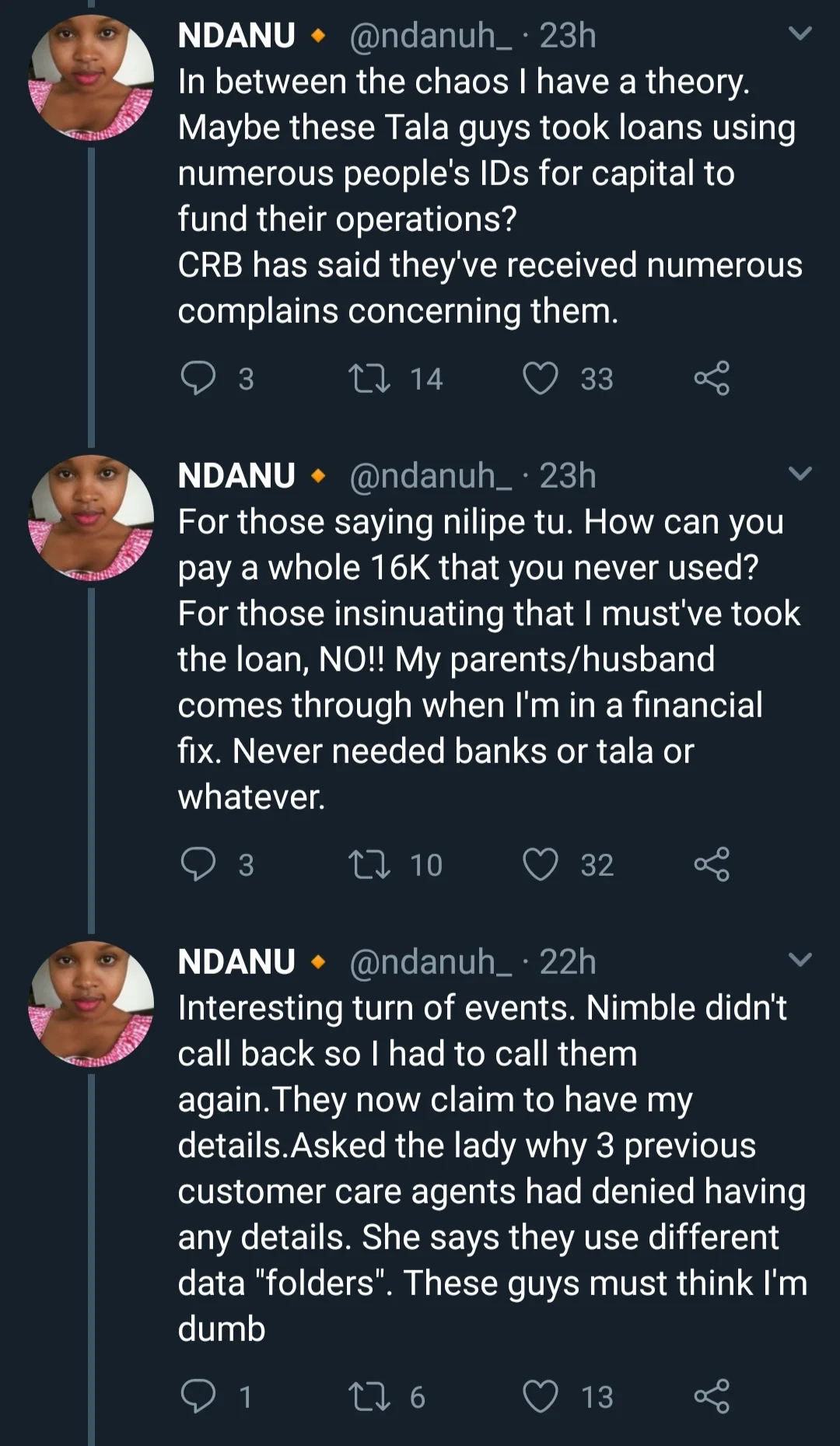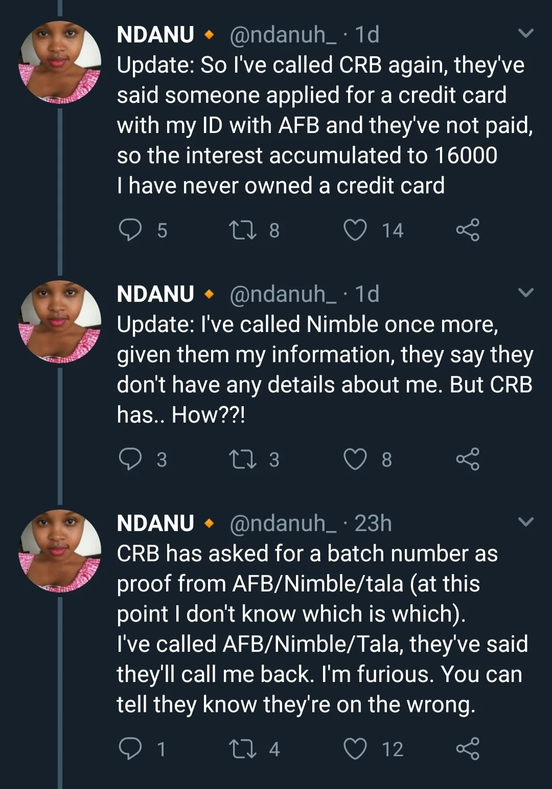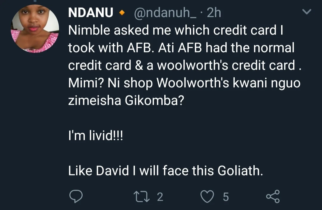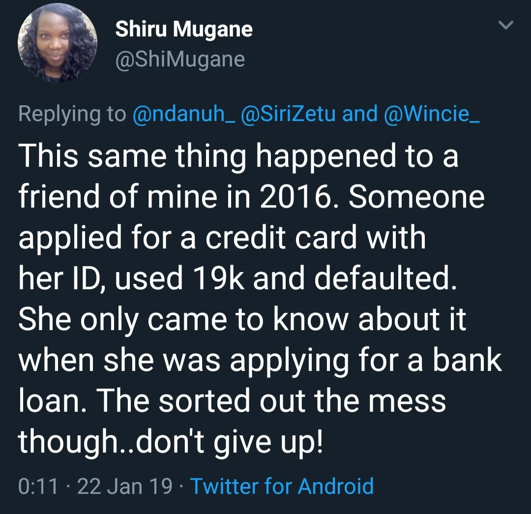 After investigating, she found out that someone took her ID number and applied for a credit card with credit card firm AFB, which later closed shop in the country. The person then defaulted and the interest increased to Ksh. 16,000.