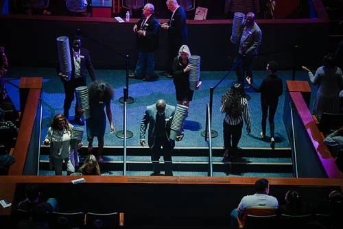 CAPTION: Church staff gather offering buckets – many congregants give a tenth of their income to Lakewood.