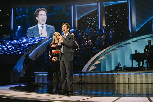 CAPTION: Joel Osteen and his wife Victoria greet Lakewood’s 16,000-strong congregation.