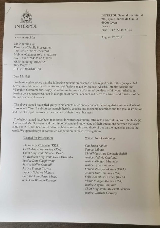 In the document widely circulated online, INTERPOL’s General Secretariat, through the United States’ Attorney “requests” Kenya’s Directorate of Criminal Investigations (DCI) George Kinoti, for his “assistance” in extradicting four top judges and an advocate from the country over their involvement in the Akasha Brothers drug scandal.