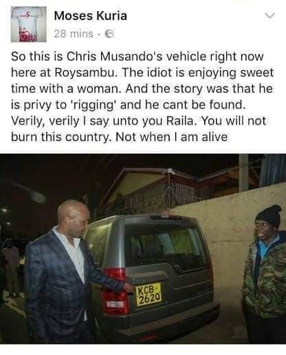 'In civilized criminal jurisdictions, Moses Kuria would be an ARGUIDO (Person of Interest) in the Death of Chris Msando. In Dead of the Night, when only Witches, Wizards & Nightrunners were out, Moses Kuria was standing by the car of Chris Msando, then dead but not yet public tomorrow, we get to hear his explanation ... But what Moses Kuria should know is that in Kenya, there is no Effluxion of Time on Crime ... He better set the record straight & offers exculpatory explanation, or one day, he will be held to account', Donald Kipkorir wrote