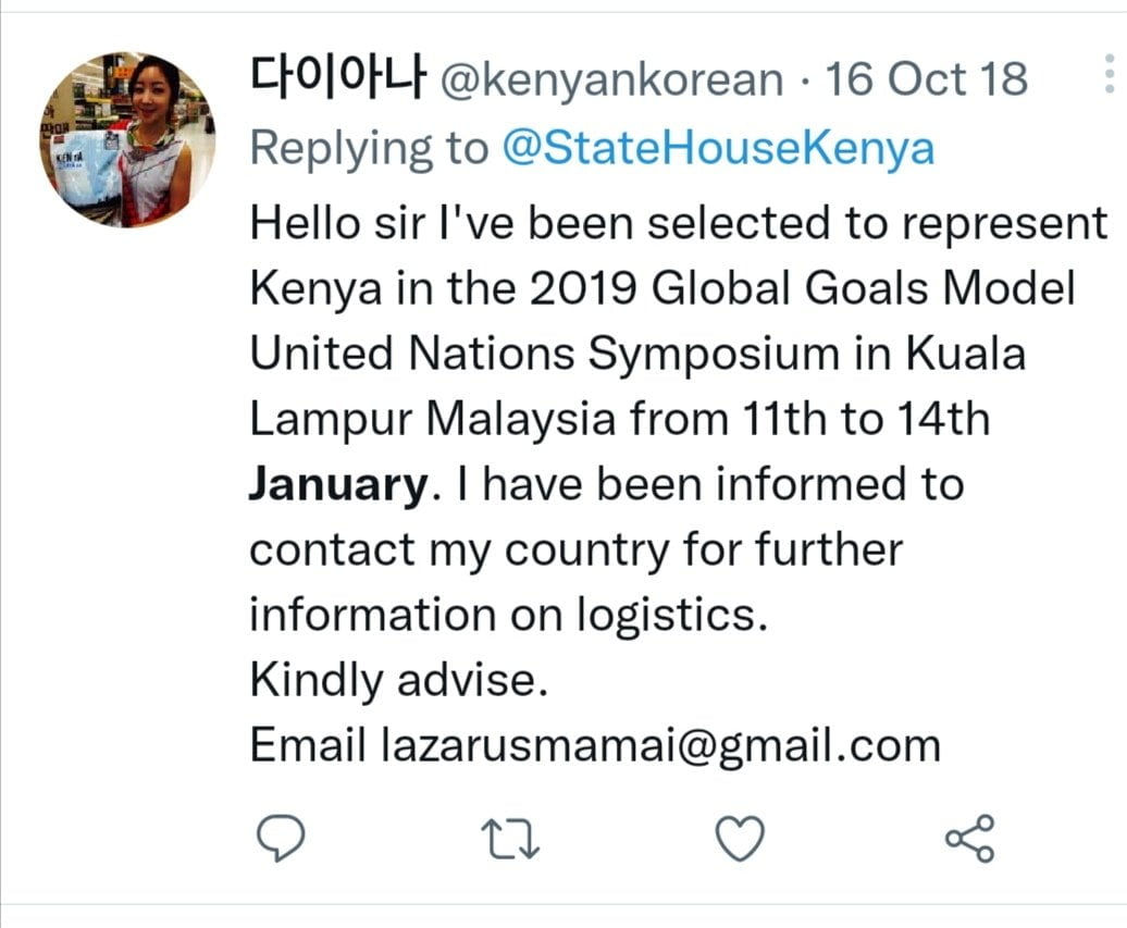 In one tweet from 2018, he seeks financial help from the State House to facilitate what he termed as a trip to represent Kenya abroad and includes his personal email address.