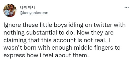 “Ignore these little boys idling on Twitter with nothing substantial to do. Now they are claiming that this account is not real. I wasn’t born with enough middle fingers to express how I feel about them,” the post reads.