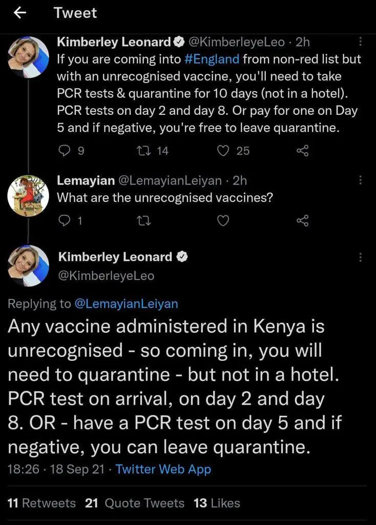 “If you are coming into #England from non-red list but with an unrecognised vaccine, you’ll need to take PCR tests & quarantine for 10 days (not in a hotel). PCR tests on day 2 and day 8. Or pay for one on Day 5 and if negative, you’re free to leave quarantine,” Kimberley tweeted shortly after UK announced that it has removed Kenya and some other countries from its red list.