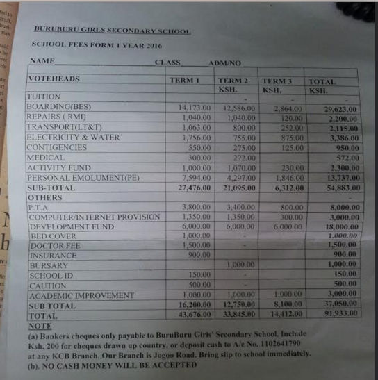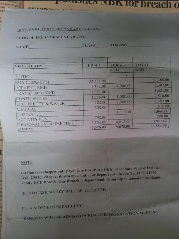 Hello and good morning Mr, Nyakundi. I wish to bring to your attention of the plight of BURU BURU GIRLS SECONDARY. This year a friend of mine got his daughter admitted at that school and he was issued a fee structure quoting Kshs. 53,554.00 for the whole academic year. To his surprise he was given another fee structur