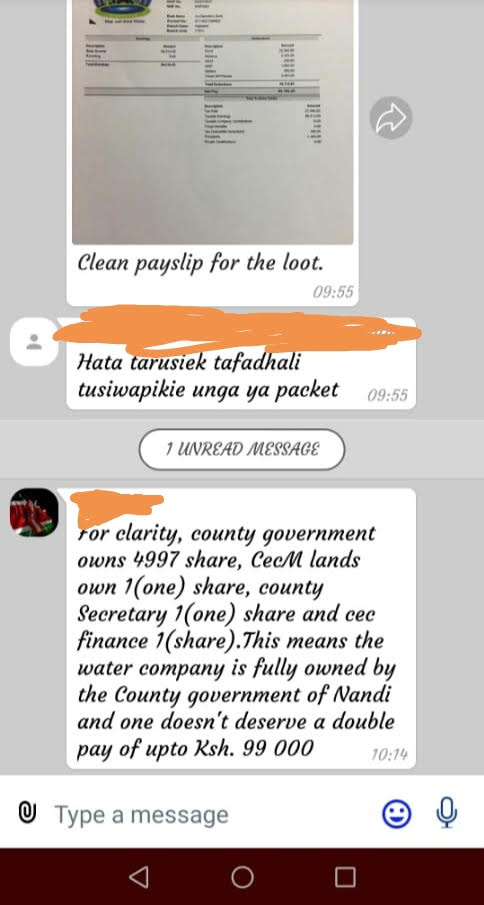 According to the Water Act 2016, the water sector is fully devolved and is owned by the County Government of Nandi. The acting Managing Director (MD) Anthony Kiboiy is seconded from the County government. He earns a salary from the county government together with an acting allowance for the position. However, he also earns a second salary from the company of over 100,000 per month plus other benefits such as airtime allowance and his car is fueled by the company.