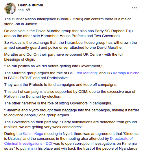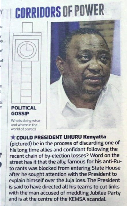 On the same day reports of the split within the ruling party, a local daily indirectly hinted that Murathe was recently blocked from accessing the State House where he had gone to seek an audience with President Uhuru and explain himself over the recent by-election losses.
