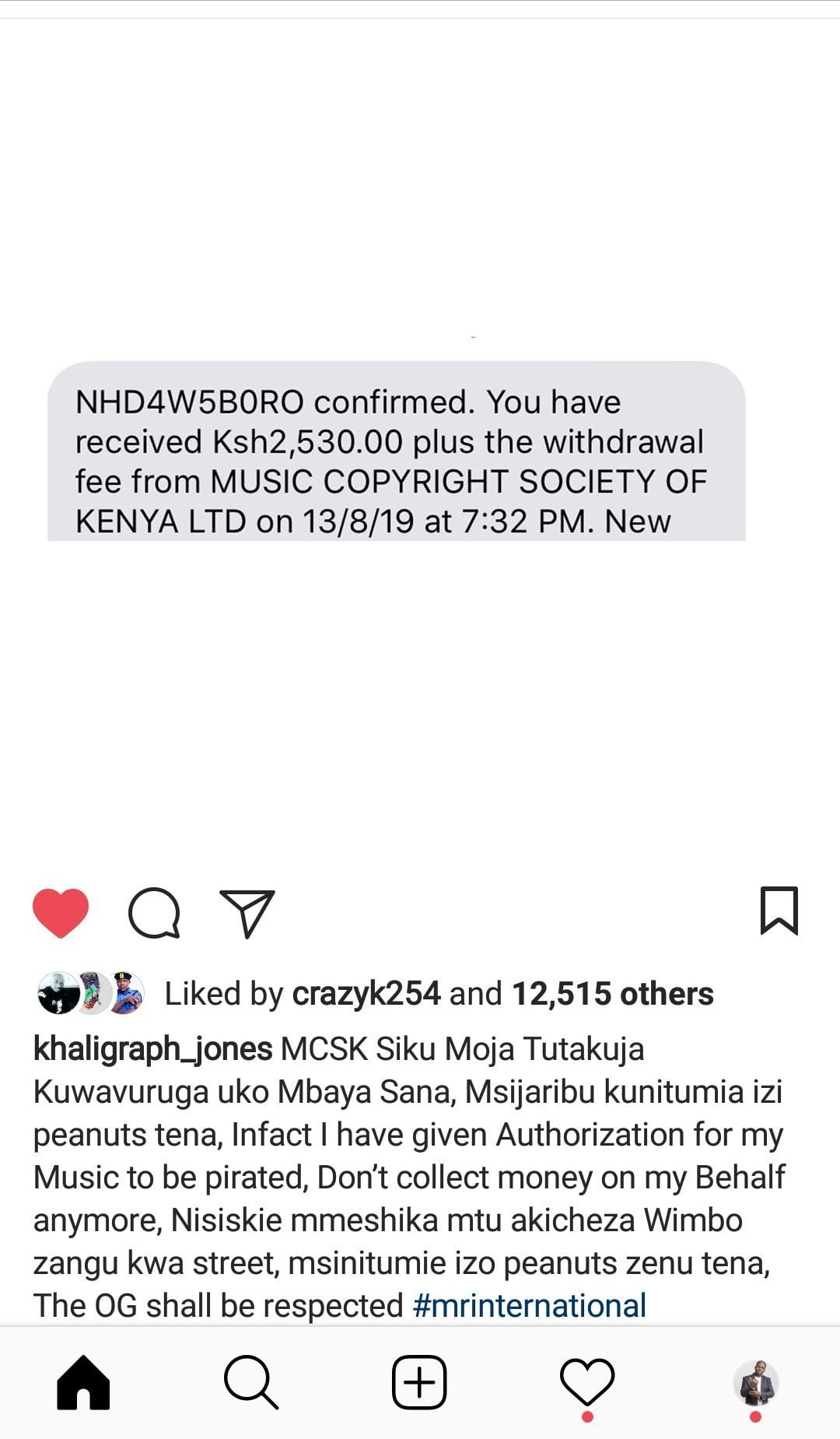 Yesterday, Kenyan rapper, one of the most active, Khaligraph Jones shared a screenshot of the pay he received as royalty from MCSK, a paltry Kshs. 2500, na 'ya kutoa'.
