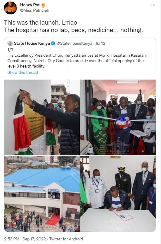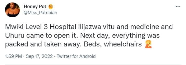 “Mwiki Level 3 Hospital ilijazwa vitu and medicine and Uhuru came to open it.