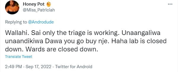Wallahi. Sai only the triage is working. Unaangaliwa unaandikiwa Dawa you go buy nje. Haha, lab is closed down. Wards are closed down,” the resident lamented on Twitter.