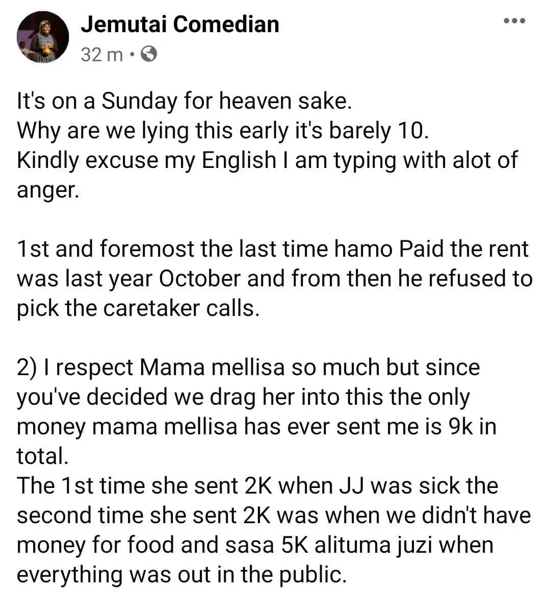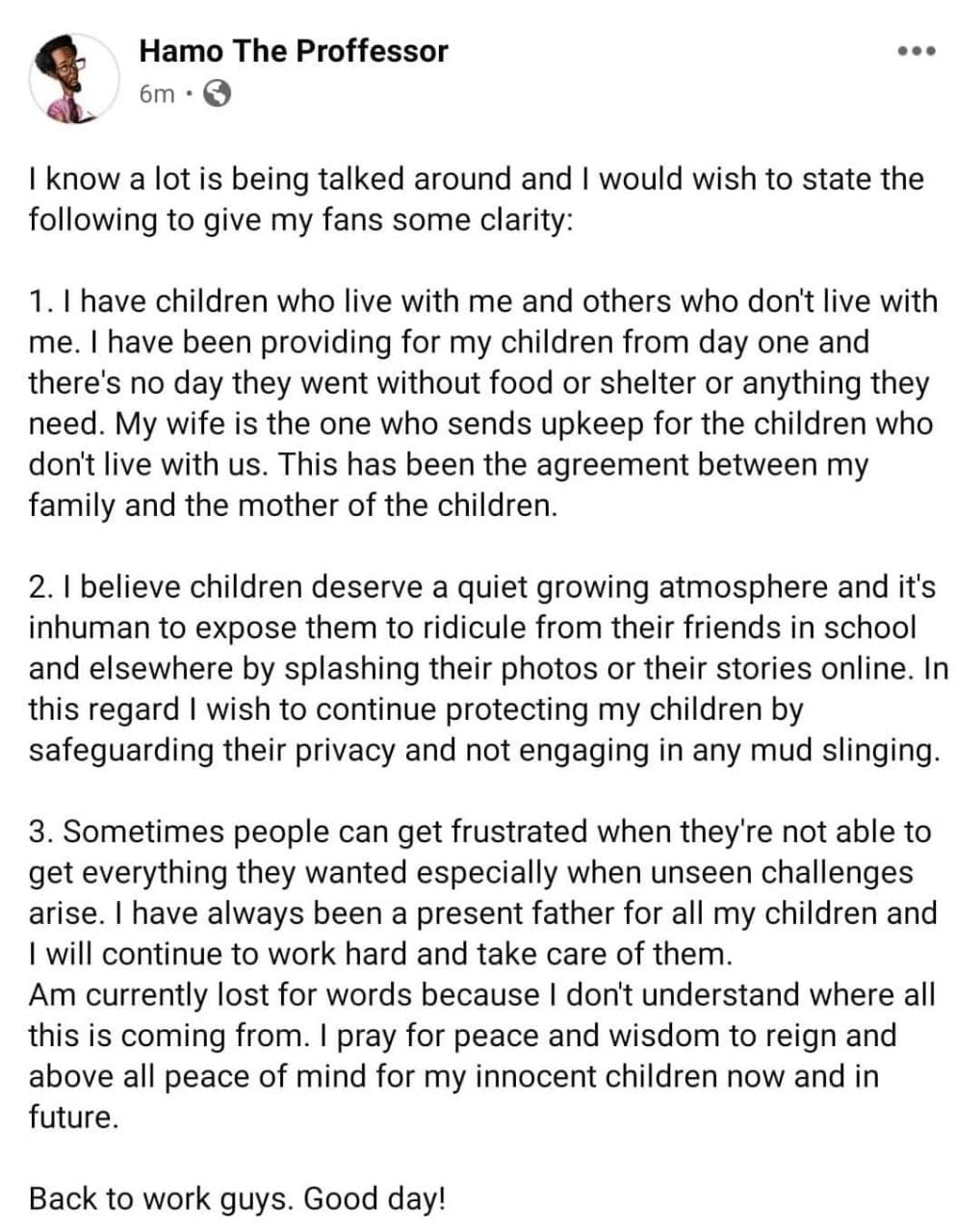 “My wife is the one who sends upkeep for the children who don’t live with us. This has been the agreement between my family and the mother of the children,” read Hamo’s post in part.