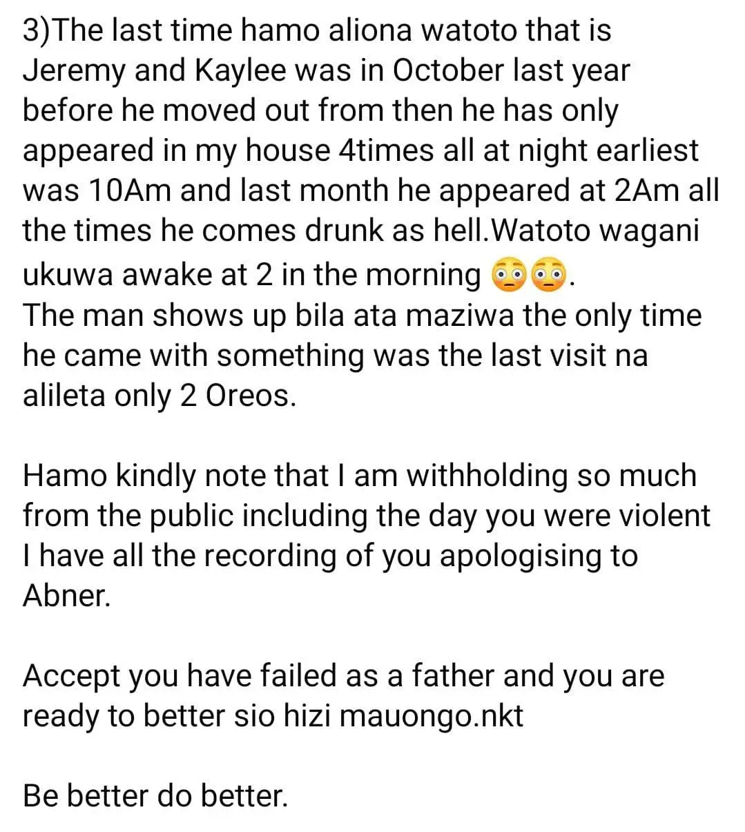 In her Facebook post published just 3o minutes after Prof Hamo’s response, she stood her earlier ground that he does not provide for the children.