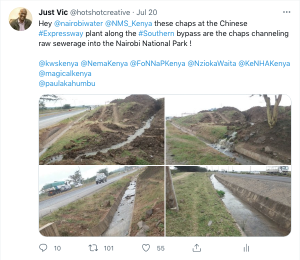 “These chaps at the Chinese expressway plant along the Southern bypass are the chaps channeling raw sewerage into the Nairobi National Park!”, he wrote in July 20th 2021.