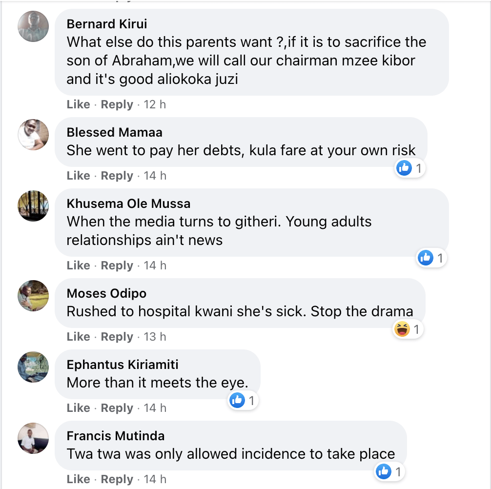But many social media users are doubting the whole thing, with others claiming that Nation Media group is under payroll to ensure that the male friend is jailed "What else do these parents want ?, if it is to sacrifice the son of Abraham, we will call our chairman mzee Kibor and it's good aliokoka juzi " Posted a social media user. " If boychild is from poor family kuna uwezekano wa a twisted narrative victimising him " "When the media turns to githeri. Young adults relationships ain't news" Posted a social media user "She went to pay her debts, kula fare at your own risk," said another social media userThis doesn't add up! pic.twitter.com/3DKlKsyXXW