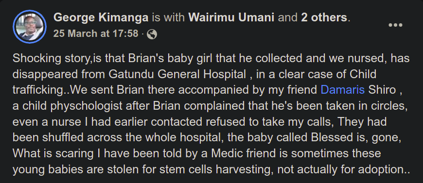 “Shocking story is that Brian’s baby girl that he collected and we nursed, has disappeared from Gatundu General Hospital in a clear case of child trafficking.