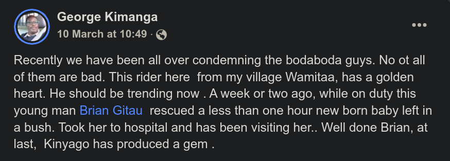 In one Facebook post published on Friday, 25th March 2022, a resident identified as George Kimanga revealed that the baby’s rescuer, a boda boda rider, reached out to him after he failed to locate the little girl named ‘Blessing’ at the health facility.