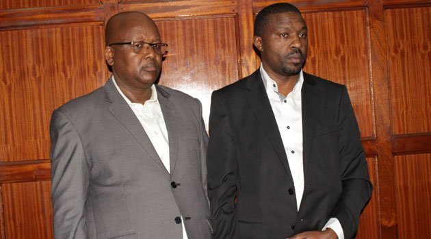 Suspended CEO Geoffrey Mwangi (right) and Finance Director Kurgat in court, they were suspended in December 2018