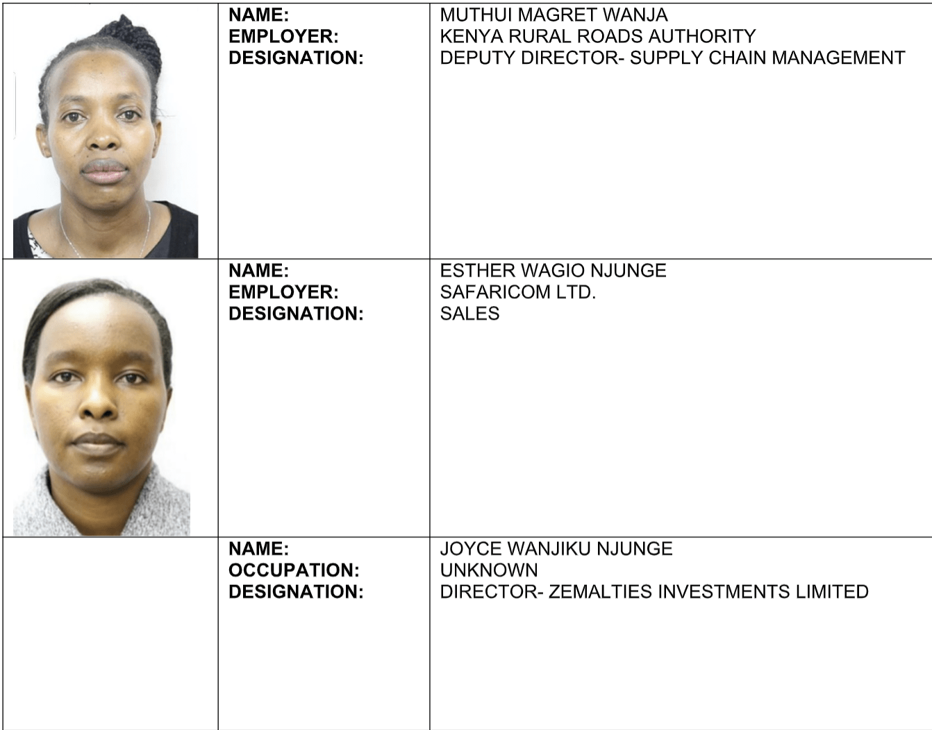 On Tuesday 22nd June Asset recovery agency obtained orders from the high court freezing the assets of the main suspects Margaret Wanja Muthui who is the deputy supply chain manager at Kenya rural roads agency [KERRA]. Esther Wagio Njunge works for Safaricom PLC as a regional sales manager.