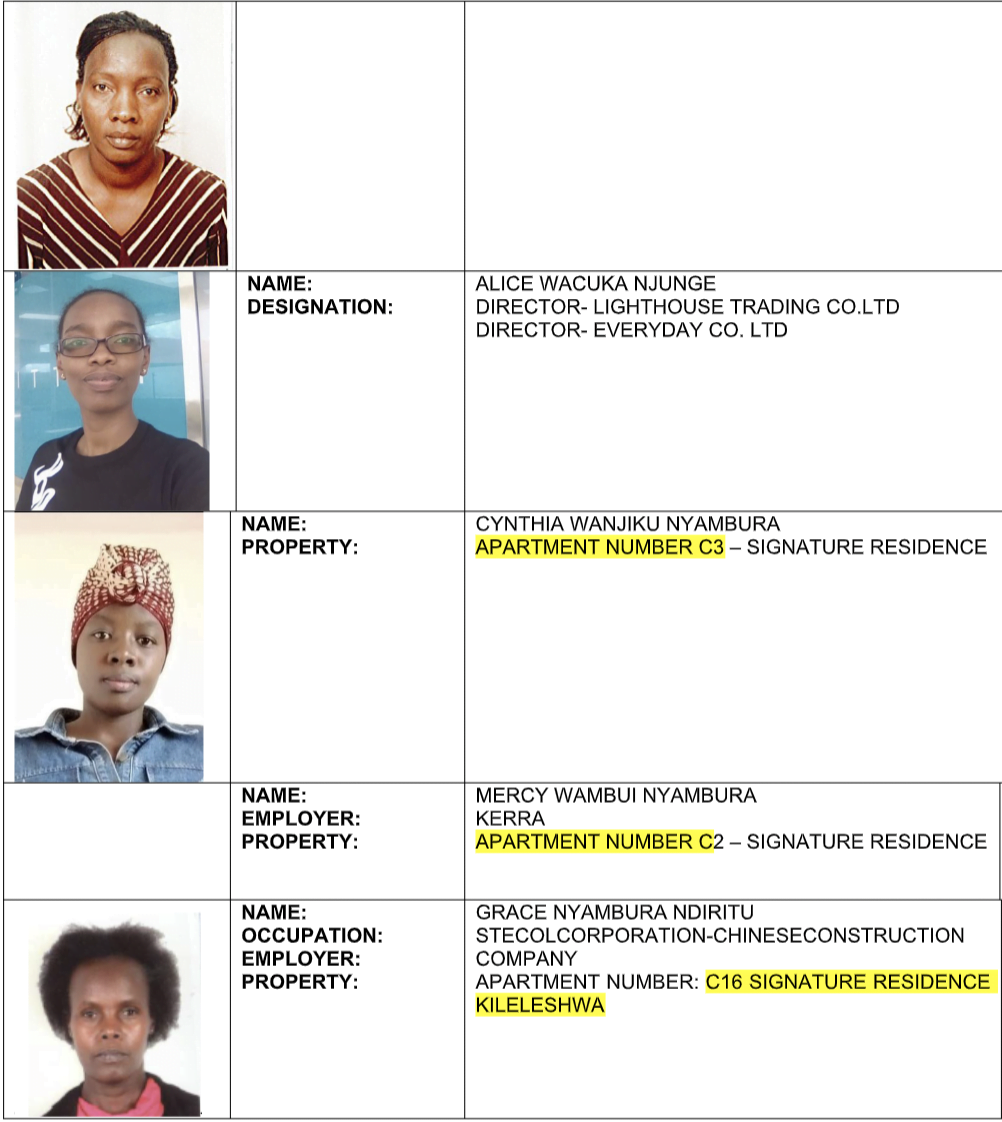 WANJA also enlisted the services of her elder sister GRACE NYAMBURA NDIRITU and her two daughters MERCY WAMBUI NYAMBURA and CYNTHIA WANJIKU NYAMBURA to register for properties on her behalf. The properties include apartment number C2 and C3 and C16 at signature residence Kileleshwa.