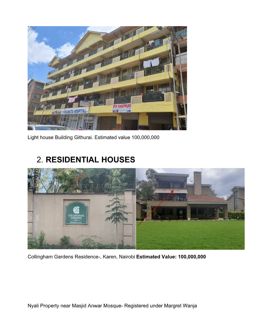 Further investigations revealed that WANJA had enrolled the services of her nieces, Esther Wagio Njunge who works at Safaricom PLC Kenya limited as a regional sales manager and Alice Wacuka Njunge to register a company under the name LIGHT HOUSE TRADING COMPANY LIMITED which was used to purchase the houses.