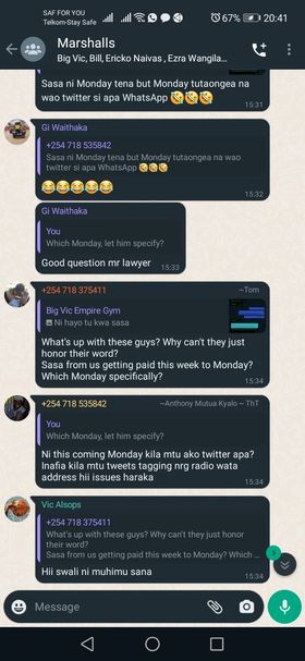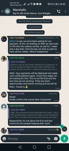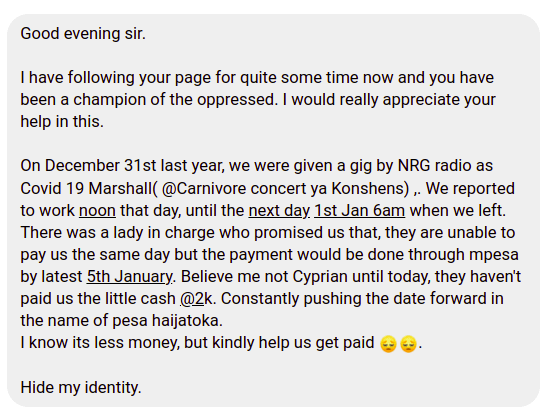 Through a message forwarded to the nyakundireport.com newsdesk, the freelance event ushers revealed that they were contracted by the company in December 2021 to serve as COVID-19 protocol marshalls during the highly publicized "NRG Wave" concert at the Carnivore Grounds.