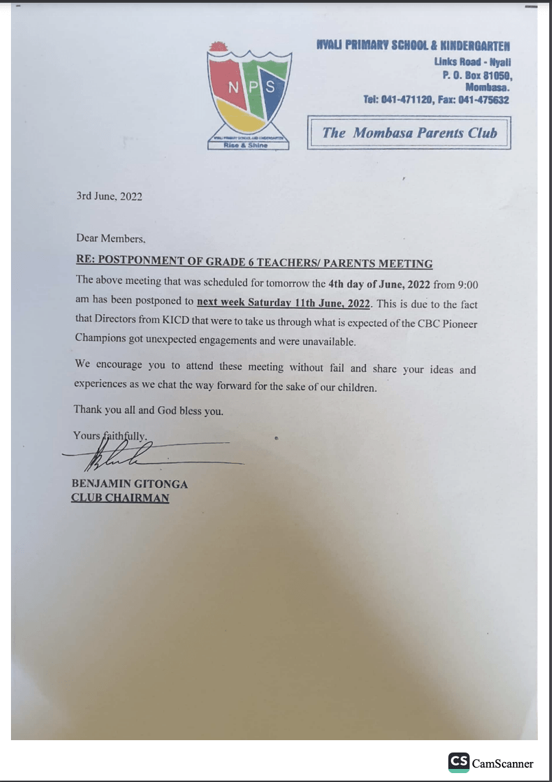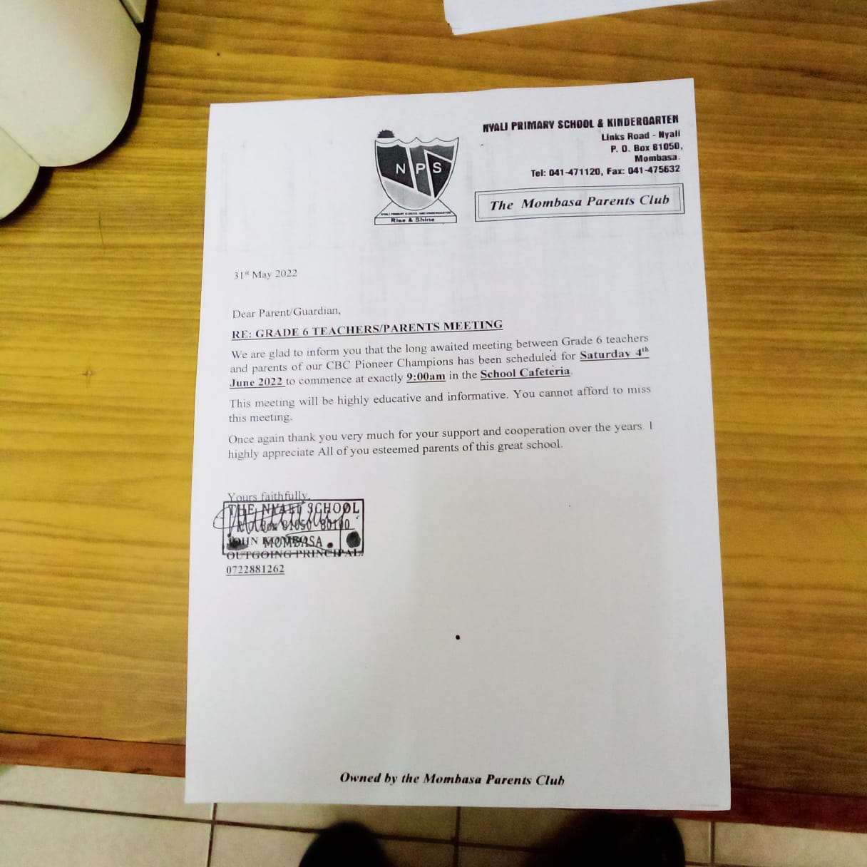 To propagate their agenda – the executive board members urgently called for a meeting on 4th June, 2022 of Grade 6 parents in a bid to seduce them to approve the construction. A letter signed by JK on 31st May, 2022 (his last day in office) was issued to the Grade 6 teachers to give to the Grade 6 kids. However, the Grade 6 teachers declined to give the kids the letter terming it suicidal as it would have meant that JK was still to attend the meeting. The teachers had seen the worst of JK and would not have liked to see him again. This letter brought a lot of anger by JK who could not believe that the teachers will even before leaving the Nyali premises refused to follow his instructions. But the truth was, JK was no longer relevant to them and they care-less.