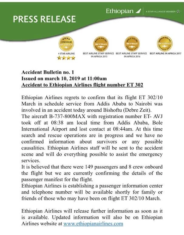 [Photo] Ethiopian Airlines Releases Official Communication After Plane Crash