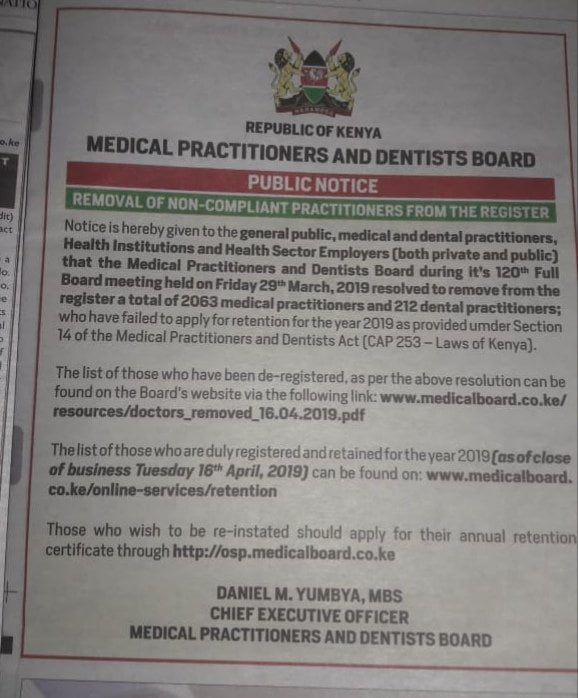 The KMPDB held a meeting in March 29th, 2019 this year and resolved to remove non0-compliant medical practitioners from the register.
