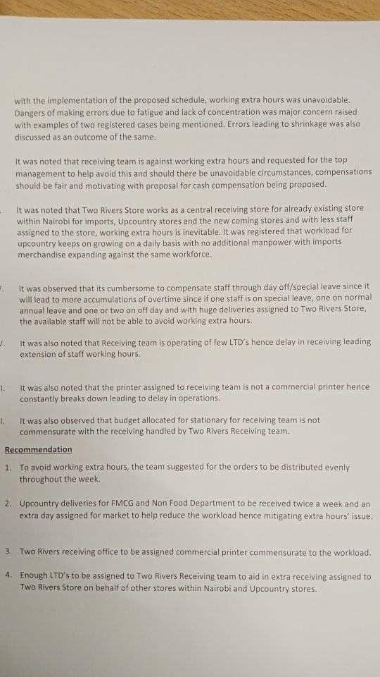 The sacking of Makokha has reportedly demoralized the staff at Carrefour Two Rivers, who fear that they too could be sacked if they speak out against the poor working conditions.